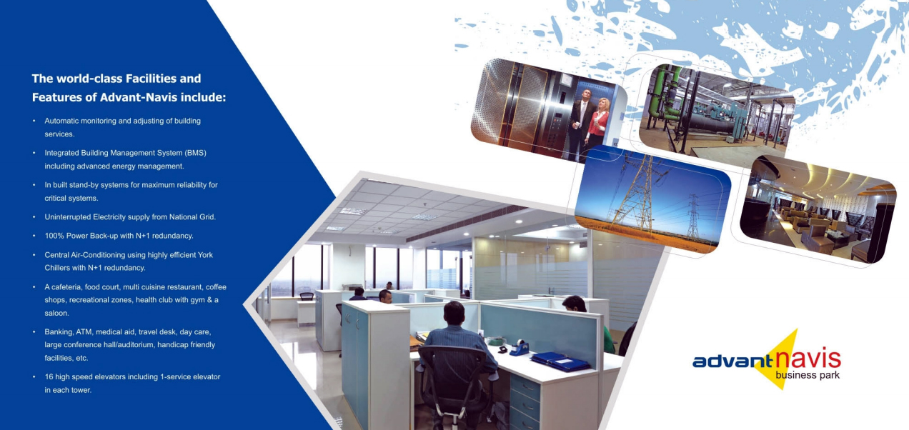 Advent navis business park is a corporate landmark on noida expressway. It is Class-A Intelligent Bright Green building with LEED GOLD CERTIFICATION. This iconic building has highly efficient water cold chiller based air condition system. There are two tower in advent navis business park tower A and tTower B. Tower A is 95% occupied and having 15 story height and having approx 4,90000 sq ft area. Tower B is having 13 story height and having approx 3,90,000 sq feet. These two towers are interconnected to each other via sky bridge. In total advent navis business park offers you a 9,91,308 sq feet covered area for office spaces. Advant navis business park is also loaded with all modern amenities like Club, multi-cushion restaurant , recreational zone and heath club with gym.