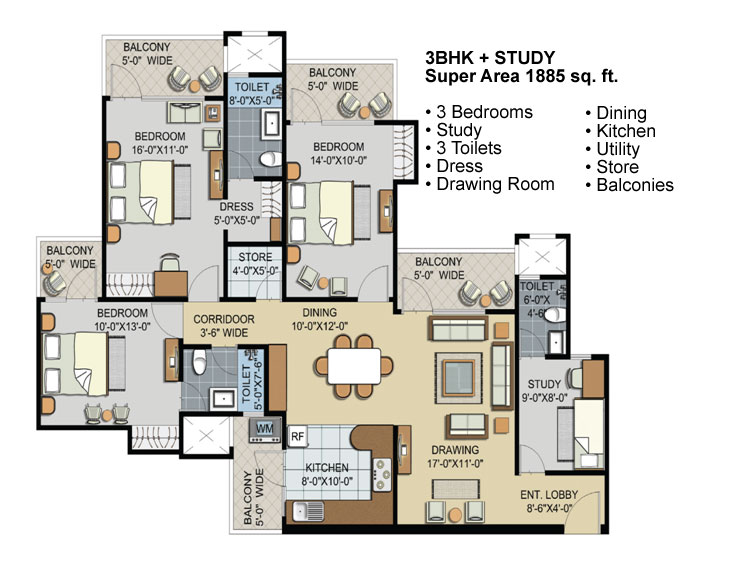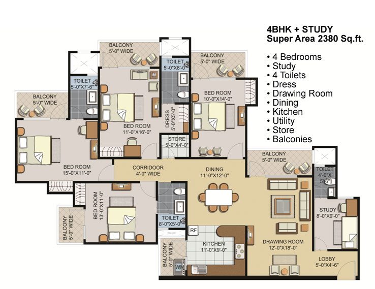 Branded vitrified tiles flooring in all bedrooms, drawing & dining, wooden flooring in Master-bedroom, antiskid ceramic tiles flooring in Toilet/bathroom and balcony.
